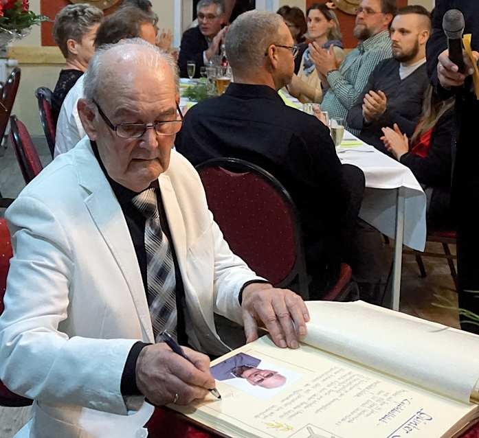 Nach kurzer Bilanz der Sportarbeit des letzten Jahres in den neun Abteilungen und den zwei allgemeinen Sportgruppen des Vereins mit insgesamt 369 Mitgliedern, die der Vorsitzende Hans-Dieter Salow zog, erfolgten wie jedes Jahr Auszeichnungen und Ehrungen. Mit Einträgen in das Ehrenbuch des Vereins wurden Adelheid Funke und Günter Schwarz gewürdigt (siehe Fotos rechts), die in ihrer langjährigen Vereinszugehörigkeit viel in ihren Abteilungen Volleyball und Leichtathletik für den Verein geleistet haben. Adelheid Funke hat seit dem Jahr 1966 für den Frauenbereich des Volleyballsports als Trainerin im Trainingszentrum und als Spielerin für den SV Einheit gewirkt. Günter Schwarz hat 21 Rennsteigläufe und 20 Harzläufe für den Verein bestritten. Schon beim ersten Haffmarathon 1983 war er dabei. Seitdem wirkt er auch im Org.-Team für diese jährliche große Laufveranstaltung des SV Einheit mit.