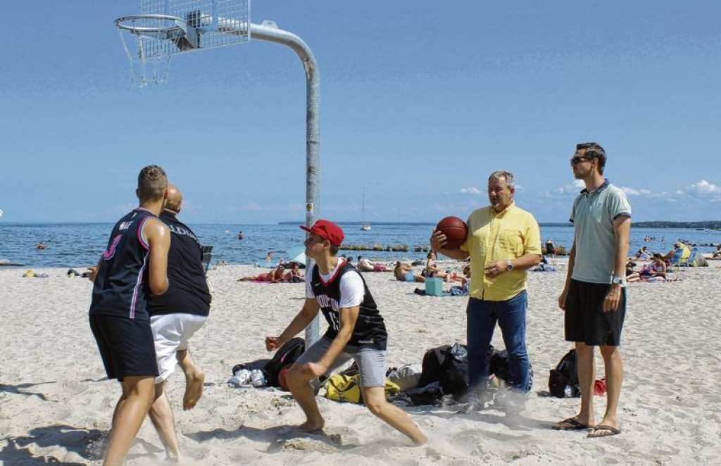 Im Haffbad gibt es eine neue Sportanlage. Auf dem Sand kann jetzt auch Basketball gespielt werden.