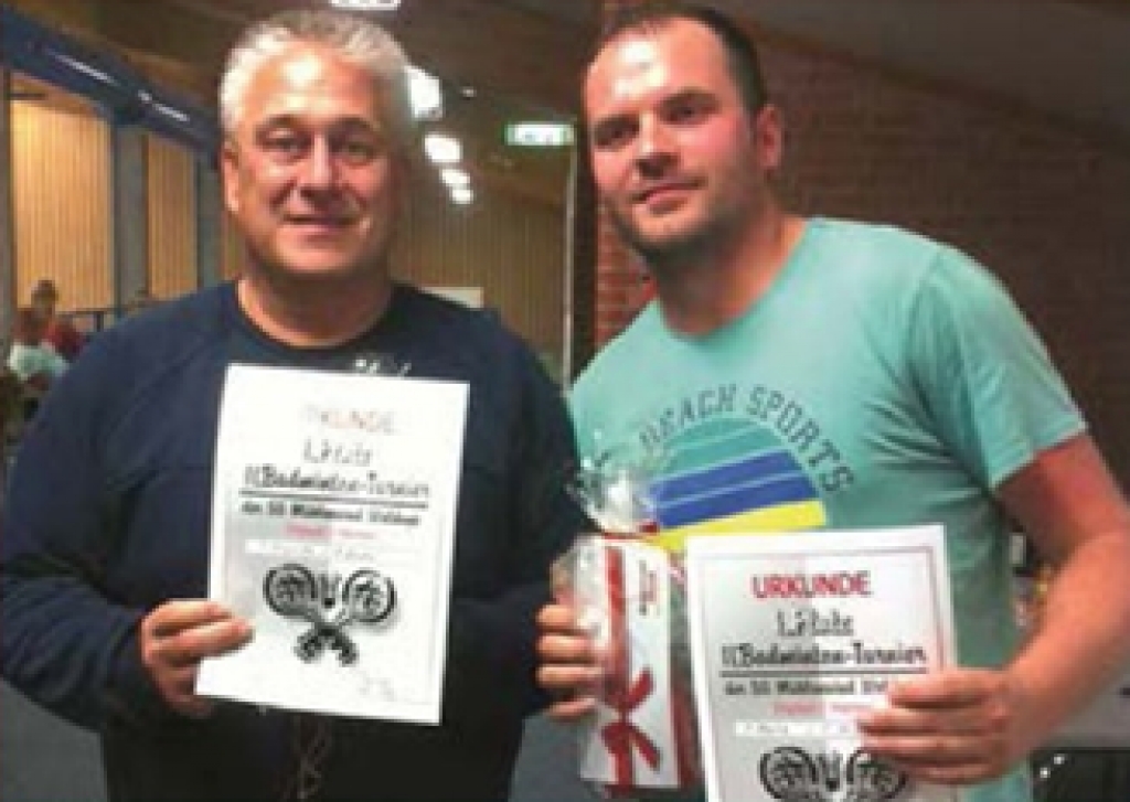 Ueckermünde. (TH) Am 01. November wurden die Ueckermünder Badminton-Spieler zum Turnier nach Woldegk eingeladen. Mit 84 Teilnehmern war die Resonanz sehr groß, sodass gleichzeitig an neun Netzen gespielt wurde. Auch Jana Bady, Frank Röske und Torsten Hischke vom SV Einheit Ueckermünde sind der Einladung gefolgt und haben ein sensationelles Turnier im Damen-Doppel, HerrenDoppel und Mixed gespielt. Dabei konnte Jana Bady mit Sportfreundin Angela Burgdorf aus Pasewalk den 2. Platz erspielen. Im Mixed hat sich Jana Bady mit Uwe Böttcher aus Greifswald den 1. Platz erkämpft. Wie immer eine super Leistung der Ueckermünderin. Frank Röske und Teamkollegin Inge Richter aus Woldegk erreichten im Mixed den 3. Platz. In einem spannenden HerrenDoppel-Finale konnten sich Frank Röske und Torsten Hischke (siehe Foto) schließlich gegen die Favoriten Ralf Burgdorf und Uwe Böttcher durchsetzen, ein toller 1. Rang für die beiden Einheit-Spieler!