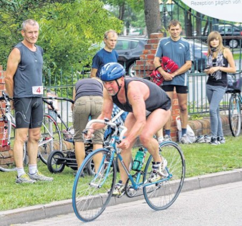 Defektes Ventil verhindert Gastgeber-Sieg Heinz Fiehn vom SV Einheit Ueckermünde belegte in der Männerkonkurrenz den zweiten Platz. Insgesamt waren beim 16. Familientriathlon in Krugsdorf 37 Teilnehmer dabei. - FOTO: THOMAS KRAUSE