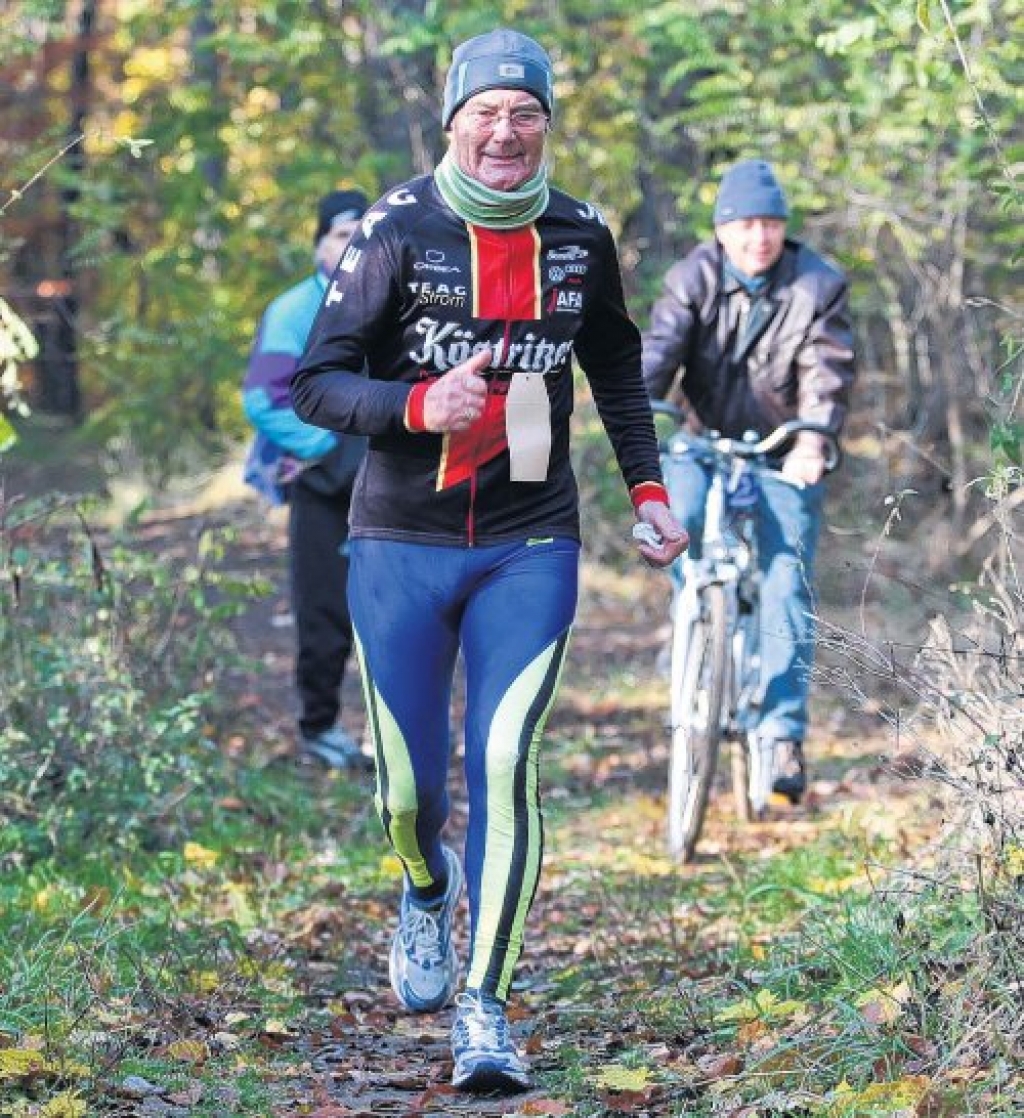 LAV-Ass Sven Lorenz läuft die beste Zeit Günter Schwarz vom SV Einheit Ueckermünde war der älteste Starter beim Torgelower Crosslauf. Schwarz lief in der Altersklasse 70 die 10,4 Kilometer in 64:52 Minuten. - FOTO: A. BÜNNING