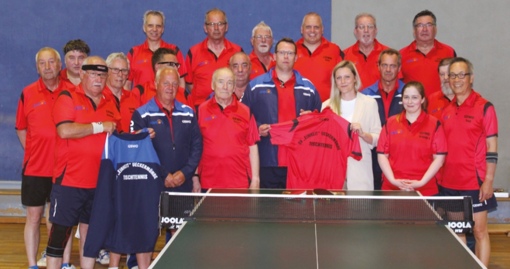 Ueckermünde. (ATT) Große Freude herrschte am letzten Trainingstag bei den Tischtennisspielern der SV Einheit Ueckermünde, denn sie bekamen neue Trikots und Trainingsanzüge vom AMEOS Klinikum Ueckermünde gesponsert. Lisa Telschow, Assistentin der Geschäftsführung, (Dritte von links, erste Reihe) überreichte Markus Podratz, dem Leiter der Sektion Tischtennis, die neuen schicken Funktionssportbekleidungen. Das ist übrigens nicht das erste Mal, wo sich AMEOS großzügig zeigte, denn die Tischtennissportler haben in den vergangenen Jahren bereits schon zweimal Trainingssachen bekommen. Zum Fototermin sind viele Sektionsmitglieder gekommen, sowohl die aktiven Spieler als auch die, die aus Spaß und Freude Tischtennis spielen. Trainiert wird zweimal in der Woche, dienstags und donnerstags, jeweils ab 18:00 Uhr an der Haffturnhalle. Der Verein sucht noch dringend Nachwuchsspieler. Der Trainingsfleiß zahlt sich aus. Die erste Mannschaft ist bereits Kreispokalsieger geworden und hat sich nach dem Halbfinalgewinn die Teilnahme an der Endrunde der Landespokalmeisterschaft von Mecklenburg-Vorpommern gesichert (wir berichteten), die in Rövershagen ausgetragen wurden. Neben dem SV Einheit Ueckermünde haben sich noch der TTC Schwerin, der TSC Rostock Süd und der TTSV Neubrandenburg für das Finale qualifiziert. Der erneute Titelgewinn für die Sportler aus Ueckermünde ist diesmal leider ausgeblieben. Sie standen jedoch auf dem Treppchen, da sie sich mit starker Unterstützung der mitgereisten Vereinsmitglieder den dritten Platz erkämpften. Trotzdem war es ein toller Erfolg, wenn man die Namen der Gegner liest. Aber ein Titel ist noch zu holen, nämlich der des Kreismeisters des Landkreises Vorpommern-Greifswald. Die Spieler bedanken sich nochmals herzlich beim AMEOS-Klinikum für die großzügige Unterstützung.