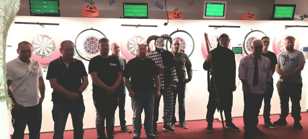 Am Samstag war unser 1. Halloween Steeldart Turnier wo wir 11 Teilnehmer begrüßen durften. Wie bei uns üblich ging es zuerst in einer Gruppenphase zur Sache. Mit 11 Teilnehmern hatten wir zwei 4er Gruppen und eine 3er Gruppe da hieß es best of 4 Legs.