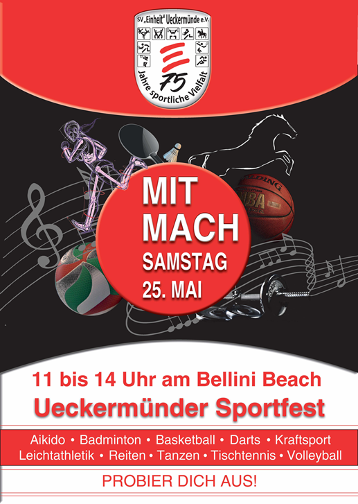 Den 75. Jahrestag begeht der SV Einheit Ueckermünde e. V. am 25. Mai ab 11 Uhr am Bellini Beach mit einem zünftigen Sportfest für Mitglieder, Nichtmitglieder und Urlauber. Jeder kann sich bei den verschiedenen Sportangeboten ausprobieren oder sich die Aufführungen der Aikido-Sportler des Vereins mit den Tendoryu Aikido Sportlern aus Berlin unter Leitung von Dr. Nawrot (5. Dahn) sowie den Haff Line Dancern des Vereins und einer Delegation von Turnerinnen des Ueckermünder Turnvereins mit ihren Vorführungen ansehen. Im Rahmen dieser Veranstaltung findet ein Empfang mit Beginn 13:00 Uhr für verdienstvolle Mitglieder, Förderer des Vereinssports und Sponsoren sowie Vertretern von Behörden und Einrichtungen statt. Für das leibliche Wohl ist gegen ein Entgelt für Nichtmitglieder gesorgt.